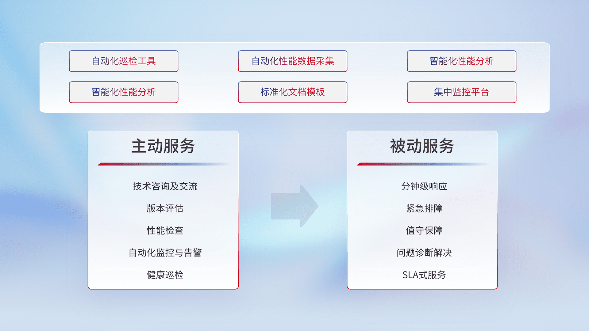 智能化工具和标准化文档,,,保障服务质量,,提供主动服务(包含技术咨询、、、版本评估、、、、性能检查、、、、自动化监控与告警、、健康巡检)和被动服务包含(分钟级响应、、、紧急排障、、、、值守保障、、问题诊断解决、、、、SLA服务)。。。